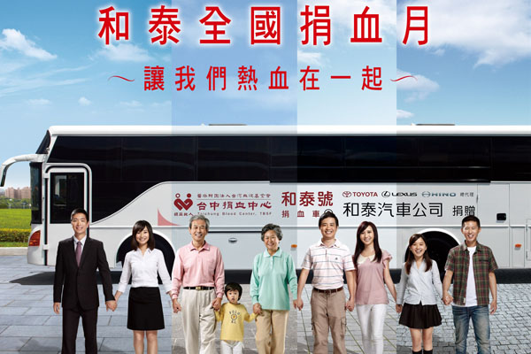 和泰汽車今年首次舉辦「和泰全國捐血月」公益活動,在為期一個月的期間中,特別拍攝了呼籲民眾踴躍捐血的公益宣傳電視廣告,另外還設計捐血月專屬的公益活動網站,目的是希望能透過各種宣傳方式,在8月血荒期號召民眾捲起袖子、熱心捐血。和泰汽車集團各經銷商在全台舉辦18個捐血活動場次、共約2000人次,率先主動響應捐血活動,期盼能做到拋磚引玉的起頭作用,讓更多人一起加入捐血行列。