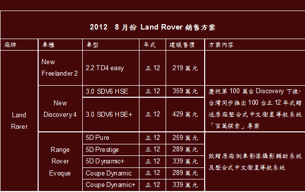 而延續慶祝第100萬部Discovery 4生產下線的喜悅榮耀,八月份Land Rover總代理九和汽車將持續限量100部的「百萬探索專案」的專屬禮遇,凡入主12年式Discovery 4的準車主,九和汽車即致贈原廠整合式中文衛星導航系統,引領熱愛自然的每位車主,與台灣7人座柴油LSUV銷售冠軍一同探索世界上最美麗的風景!