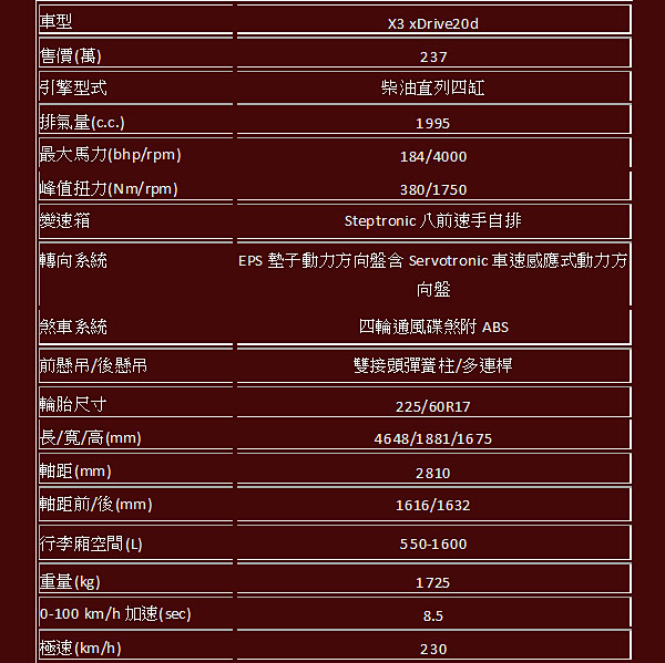 BMW X3 xDrive20d五視圖與基本規格表