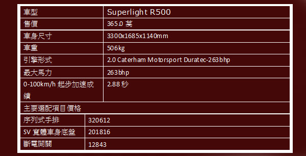 至於於發表會中亮相的Superlight R500,尚未通過EU5認證,因此在台灣無法領牌,但車主仍可以掛試車牌方式上路,而針對Caterham其他車款,德國歐馬汽車皆可代為訂車,讓台灣車迷可以擁有專屬於自己的Caterham跑車。