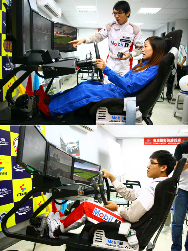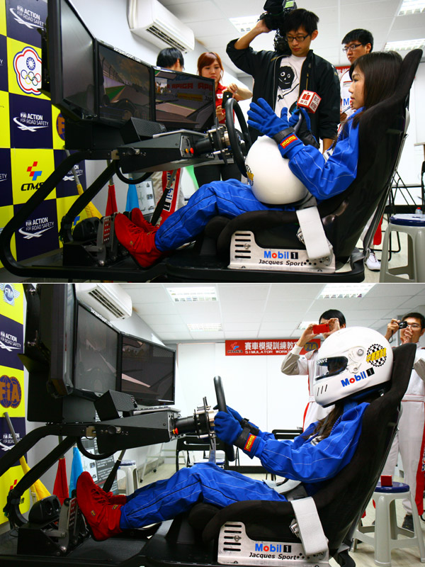前往採訪的電視台女記者,也全副武裝體驗賽車模擬器所帶來的擬真賽車感受。