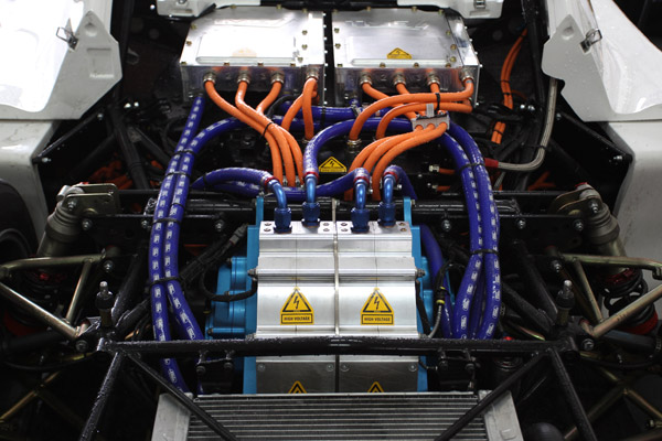圖為TMG EV P002賽車的電動傳動模組,它以TMG創新的DC快充器進行充電,這是一項零污染的賽事專用科技。
