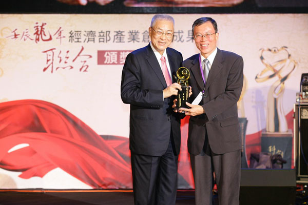 吳敦義(左)副總統親自頒授國家發明創作獎--貢獻獎予車輛中心,由廖慶秋副總經理代表接受。