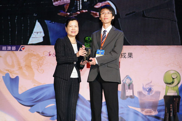 經濟部智慧財產局局長王美花(左)親自頒授國家發明創作獎給蘇一峰工程師。