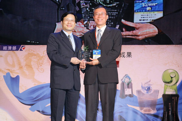 車輛中心廖慶秋副總經理獲得科專計畫優良計畫主持人獎,由經濟部技術處長林全能處長(左)親自授獎。