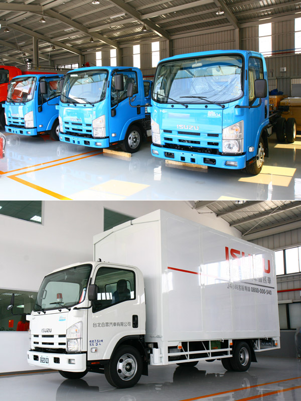一字排開待交車的NLR底盤車(上)、與擔任合眾汽車服務車的NPR框式貨車(下),這兩款車型仍是Isuzu的銷售主力。