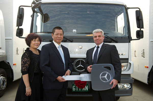 台灣賓士售後服務處副總裁史安德親自將三輛客製化的Atego 1224卡車交付給東展交通負責人李永銘先生。