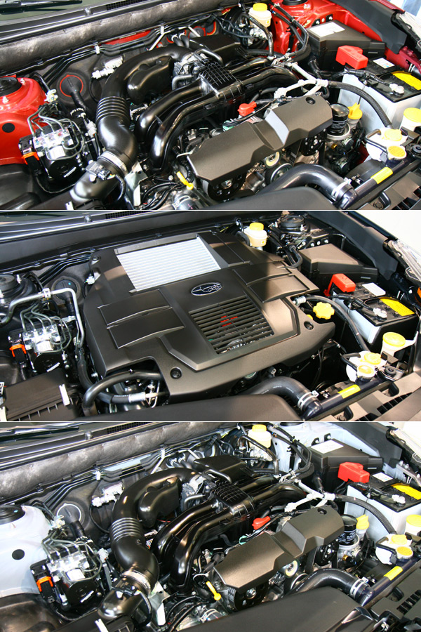 由上至下分別為Legacy 2.0i、Legacy 2.5GT、與Legacy / Outback 2.5i的動力單元,其中2.0i / 2.5i為符合Euro5規制的FB系自然進氣引擎。