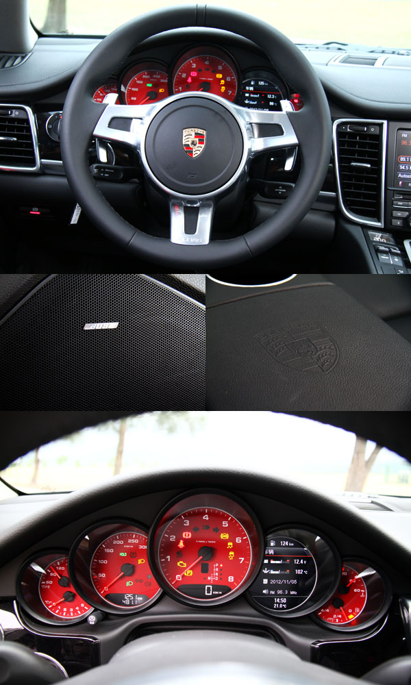 Sport Design 方向盤 (含換檔撥片)、紅色儀錶板底色皆為Panamera Sport 勁裝特仕版的標準配備。