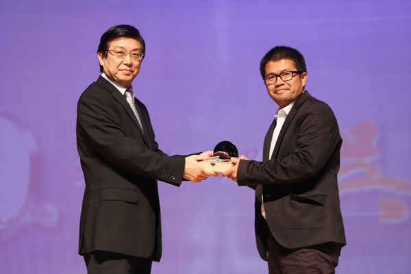 本屆評審團總召集人蘇正平先生(左),頒發「新聞深度報導獎」予《商業週刊》獲獎代表。