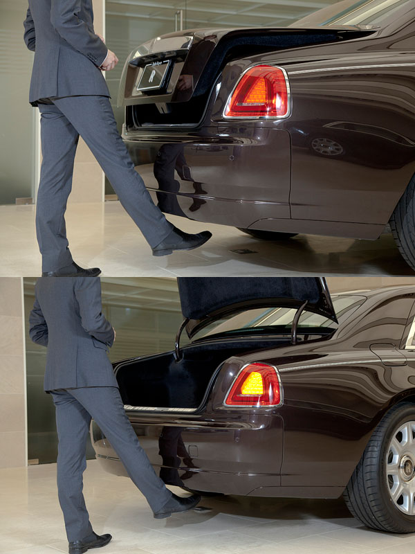 全新13年式Ghost的免鑰匙晶片控制系統更增加了便利的智慧型車廂開啟功能,當雙手均持物品時,您只需隨身攜帶鑰匙,並將腳輕鬆的移動到後保險桿下方,後車廂即可自動開啟。