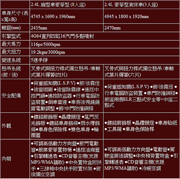 搭載原廠代號4G64的2.4升汽油引擎,具備116ps/5000rpm最大馬力,與19.2kg-m/3000rpm峰值扭力。