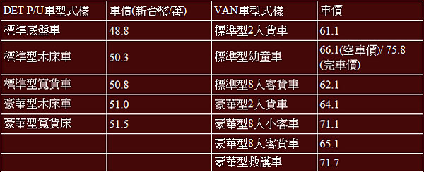 Super得利卡基本規格表與售價表