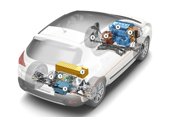 所謂的HYbrid4複合動力系統,是於前軸部分由一具柴油引擎做為驅動來源,而在後軸的部分則是以電動馬達驅動,並且達到四輪傳動的效果。而在3008 HYbrid4上,搭載了一具2.0升HDi柴油引擎,可輸出163hp/3750rpm最大馬力與30.6kgm/1580rpm最大扭力,燃燒室採用Extreme Conventional Combustion System (ECCS)技術,並且導入新一代共軌缸內直噴系統、可變幾何渦輪系統,供油壓力可達2000bar,同時採用最新八孔壓電式噴油嘴,可有效讓油氣霧化,使燃燒更為完全,搭配上Stop & Start引擎怠速熄火系統,讓這具引擎具有最低地油耗表現。並且在引擎熄火的同時,提供8kW的電力,以維持車輛電子系統所需電力。在後軸的部分,則是搭載一具可輸出27hp之永磁馬達,並且順間可迸發37hp馬力,扭力部分則有10.2kgm,瞬間可在輸出20.4kgm,使得綜效最大動力輸出可達200hp與51.2kgm〈500Nm〉,並且搭配BMP6店子六速序列式手排變速系統。同時藉由置於後軸之PTMU動能電力管理系統,有效分配動力與電力輸出,以達到最佳地節能表現,因此3008 HYbrid4每行駛一公里的二氧化碳排放量僅99g,平均油耗也可達到約31.6km/L。
