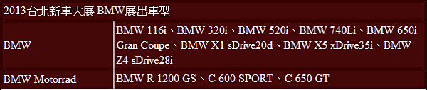 即將於2012年12月21日至12月24日假台北世貿中心一館舉行之「2013台北新車大展」,BMW即將展出多款全新車型。