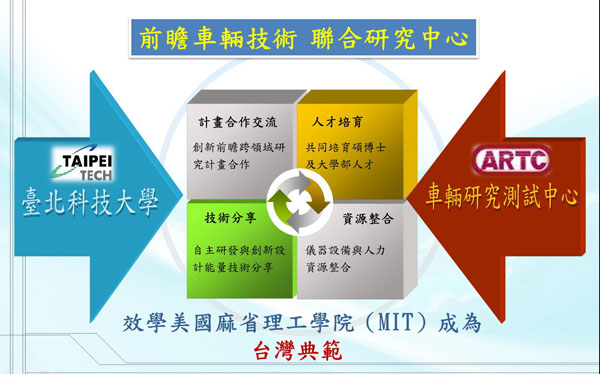 前瞻車輛技術聯合研究中心是個長期的學研合作平台,由榮獲100年國家產業創新獎(績優創新研究機構)與101年國家發明創作獎(貢獻獎)的車輛中心,和兼具學術與實務的教育部典範科技大學--北科大一同攜手打造;透過兩個優秀學研機構的資源投入,將以車輛電動化、智慧化等符合產業需求的關鍵技術為命題,讓台灣的車輛自主研發更紮實、更深入。合作的第一階段,將投入包括增程式柴油引擎發電機模組及電動空調系統之設計與控制等前瞻研發技術,可運用在產業界目前非常熱門的增程型電動巴士與電動小汽車相關產品。同時,透過此平台整合包括機械、電機、電子控制和工業設計等跨領域的人才培育,不僅讓學生有更多研究實習機會,也加強學理和社會工作實務面的連結。