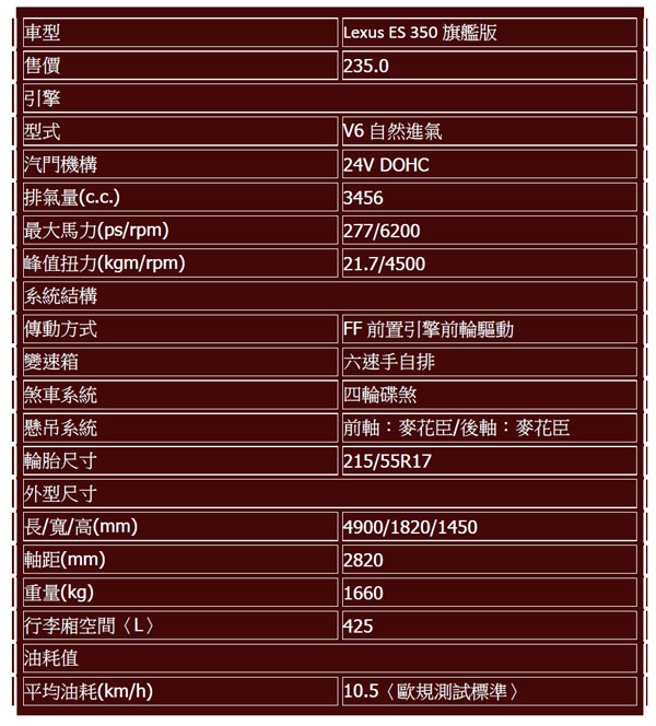 憑藉著Lexus優越的品牌光環,讓旗下所有車款銷售表現都非常亮眼,面對Audi A6、Bmw 5-Series、M-BENZ E-Class與Jaguar XF等歐系中大型豪華房車,更一次派車GS與ES兩個車系上下夾殺,其中ES車系雖然駕駛感不受熱血族群喜愛,卻很合台灣消費者胃口,不需要認識太多繁複的先進科技,就可以輕鬆駕馭,ES 350的輕盈動態表現也可以滿足多數人對所謂大動力的需求,價格上又有相對優勢,讓ES 350仍然是許多消費者入主高階中大型豪華房車的首選。
