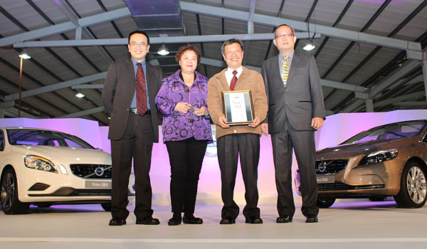 藉著台中車展,國際富豪汽車總裁陳立哲(左)與售後服務處處長姚祖瑋(右)特別頒獎給予彭淼廣賢伉儷。