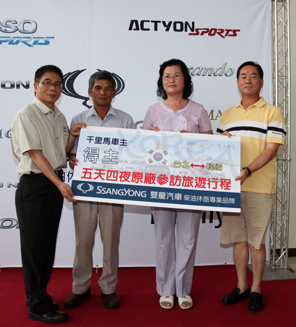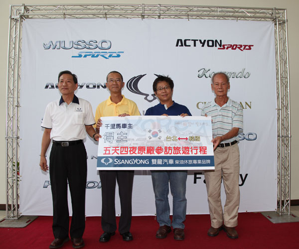 3位「榮耀獎」車主,分別是來自台中的林淑女小姐、嘉義的吳志明先生及台南的黃耿雄先生;而入圍「傳承獎」的10款車,從Korando、Korando Family、Musso、Chairman、Rexton、Musso Sports、Stavic、Actyon、Actyon Sports到Kyron車系,其中以Korando Family的19歲車齡為最、而總里程數以Musso的437,393公里為最多,並在所有車主共同見證之下,抽出嘉義佑泰營造工程有限公司〈Korando〉、桃園長霖工程行〈Rexton〉與台中林三發先生〈Actyon Sports〉為「傳承獎」得主,以上共6位車主獲得本次千里馬車主徵選活動的最大獎:韓國5天4夜原廠參訪旅遊行程一位名額,將在入秋時節,深度體驗韓國文化、美食與自然風光,同時前往位於平澤市的SsangYong Motor Company進行參訪。