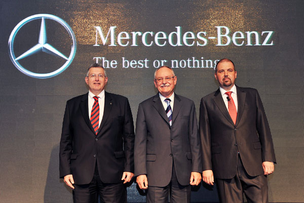 (左起)台灣賓士售後服務副總裁漢勒斯、總裁葛福睿及副總裁波利斯與全新M-Benz企業識別合影。