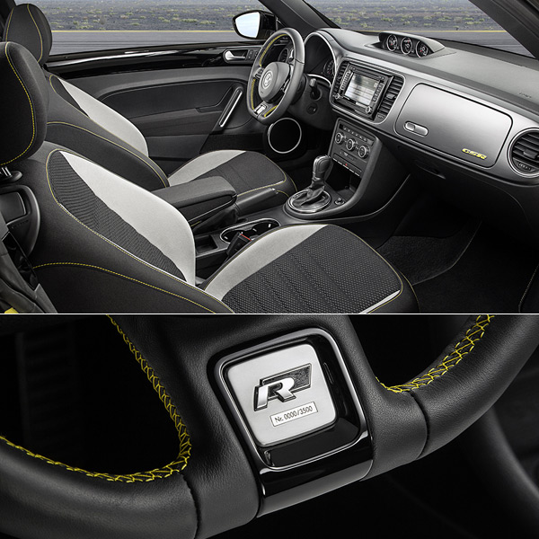 以Beetle 2.0 TSI R Line車型為基礎的Beetle GSR,內裝以黑色為主、黃色則是點綴,而方向盤上更有限量流水編號的銘牌。
