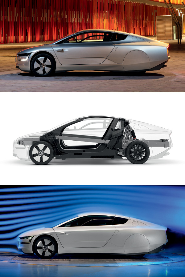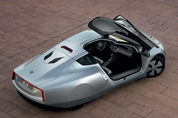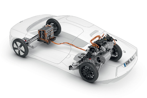 VW XL1號稱全球最省油的量產車,其超低平均油耗達111.11km/l,碳排放也僅22g/km,達成此節能成效的手段,當然包括歐陸開始普及的plug-in hybrid插電充電複合動力模組,以及電動馬達的運用。XL1的plug-in hybrid傳動系統包括一具輸出47hp馬力的0.8升雙缸TDI柴油引擎,還有一具輸出27hp的電動馬達,並搭配一具七速DSG雙離合器變速箱、以及一具鋰電池模組。