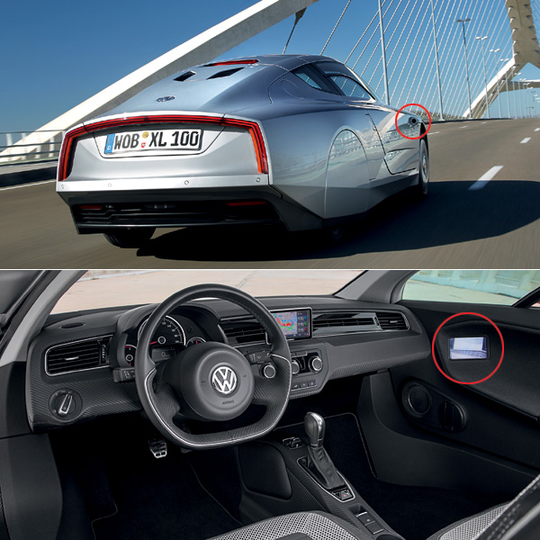 XL1取消後視鏡的設置,並改以紅圈所示的即時影像監控系統傳遞至車內LCD螢幕上。