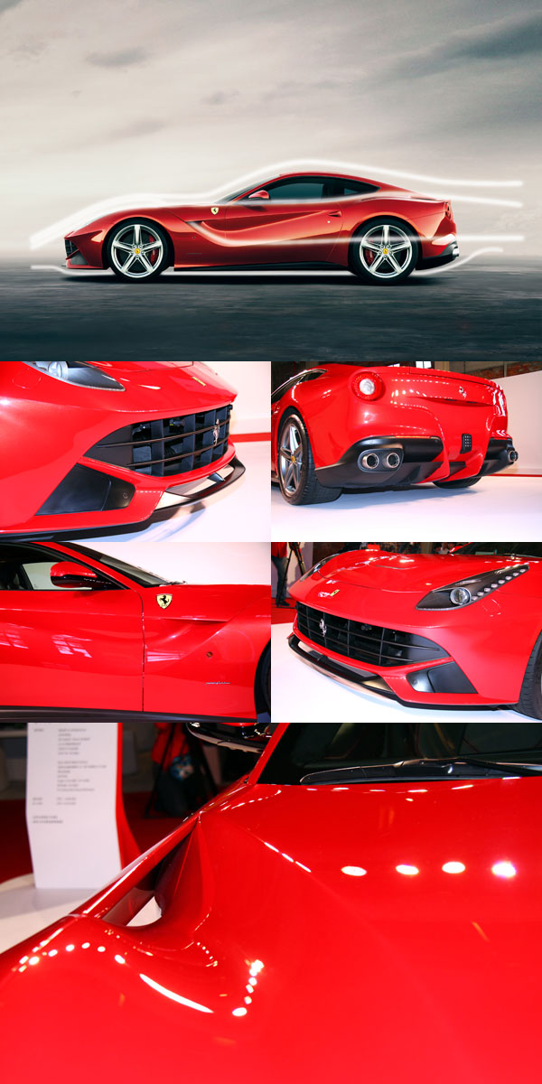 由Ferrari造型中心與賓尼法利納聯手打造的車身造型。擁有無與倫比的空氣動力學特性,搭配和諧優雅的車身比例,完美彰顯FerrariV12前置引擎車型的獨特氣質,這款雙門跑車線條流暢而不乏野性,並針對不同個性的車主,推出兩種全新配色方案:Rosso Berlinetta和Aluminium。