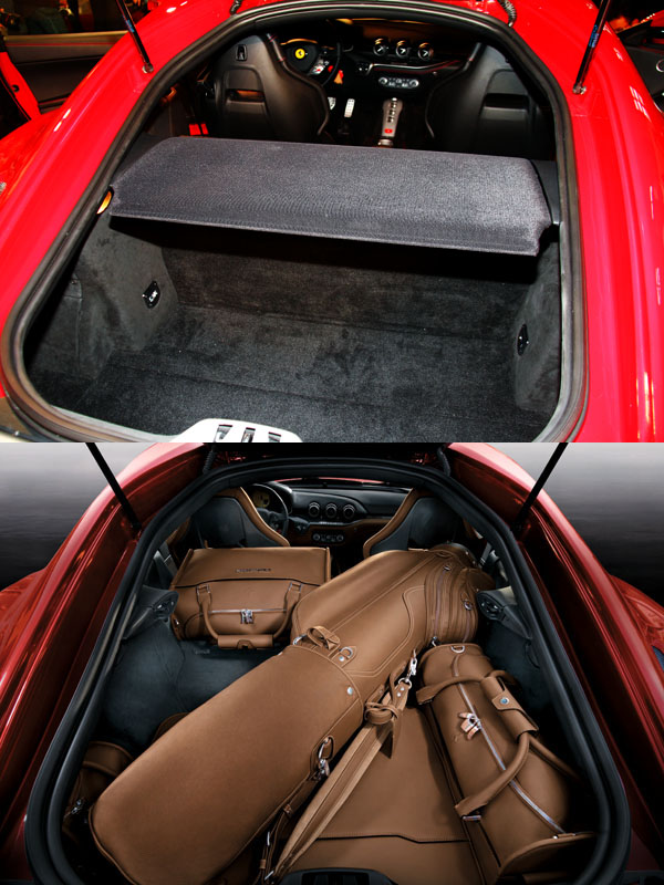 F12 Berlinetta不僅內部配置空間實現最大化,座位後方亦擁有更大容量行李廂,基本容積為320L,並可藉由放倒車艙隔板擴充至500L。