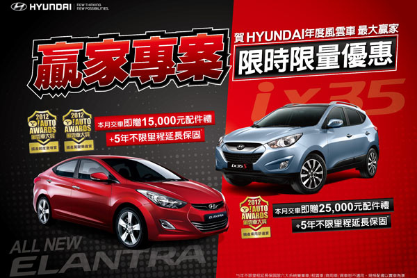 獲得「帥度激增賞」及「駕駛樂趣賞」雙料冠軍的Elantra,在本月(3月)底交車依然維持贈送15, 000元配件禮。時尚掀背轎旅i30在本月(3月)底交車可享高額度50萬零利率。以上國產車系除各上述優惠外,Hyundai讓你再享五年不限里程延長保固。