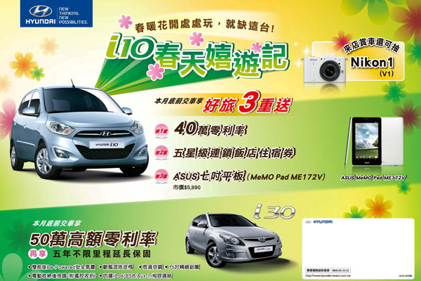 同時唯一進口微型旗艦i10在本月(3月)交車享「好旅3重送」:高額度40萬零利率、五星級連鎖飯店住宿券、ASUS七吋平版(MeMO Pad ME172V),總優惠價值達市價30,000元。