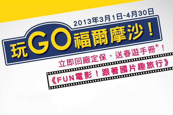 活動期間為愛車安排回廠定期保養,即可於全台服務據點獲得回廠定保好禮─《FUN電影!跟著國片趣旅行》春季旅遊手冊,帶您跟著國片去旅行。