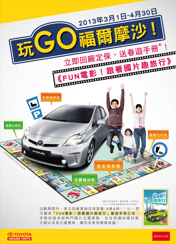 3月即將進入春季旅遊的熱門季節,和泰汽車為讓計畫全家出遊的車主享有周全的春季旅遊計畫,特別規畫《FUN電影!跟著國片趣旅行》春季旅遊手冊,提供Toyota車主全台旅遊景點介紹,手冊收錄多部熱門國片電影拍攝景點,介紹周邊各種吃喝玩樂去處,還提供各式餐飲、住宿及伴手禮優惠券。活動期間內,車主回廠實施定保套餐即贈《FUN電影!跟著國片趣旅行》春季旅遊手冊乙本,快帶家人走入電影時光隧道,乘著春風去旅行吧!