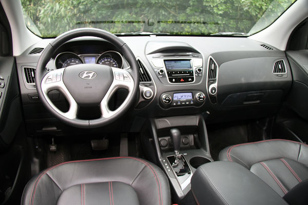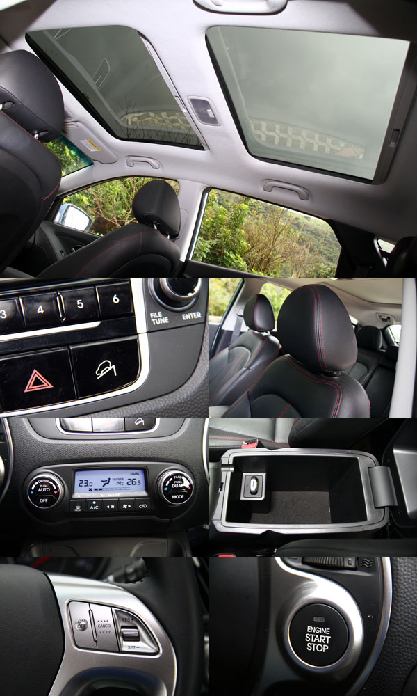 座艙中,Hyundai則是改用〝X〞做為基礎元素,將中控台均衡劃分為左右對稱設計,再以不同幾何形狀組合各項介面,擁有國產SUV少有的前衛感,並採黑色基調搭配銀色類金屬飾板點綴,整體質感在水準之上,而為呼應〝S〞車型定位,真皮座椅以紅色縫線縫製,增加些許動感氣息;配備方面,試駕的旗艦版本,擁有全景式天窗、Push-Start 按鈕啟動、雙區恆溫空調、定速系統、多功能音響系統等,同時還有HAC上坡輔助起步系統、ESP車身穩定系統、DBC斜坡緩降輔助系統以及ROP車身防傾保護系統等也都為標準配備,相當豐富。
