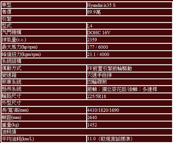 ix35 S雖然比起Honda CR-V與Toyota RAV4等日系對手上市時間較長,不過整體產品力卻一點不會輸給上述對手,除了無謂的國籍情結,擁有價格優勢的ix35 S乃不失為一款實惠又好用之國產SUV選擇。