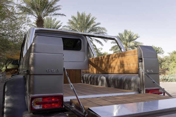 G 63 AMG 6x6 pick-up在車尾平台部位採用結實的竹材包覆製成,視覺上也十分特殊。