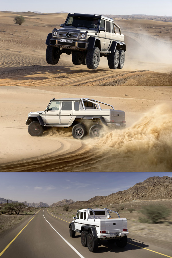 結合優越的6x6傳動科技、AMG雙渦輪V8動力、與截然不同的外觀呈現,Mercedes-Benz G 63 AMG 6x6是一輛終極的off-roader:544hp馬力、6x6傳動、五具差速鎖定器、拱式輪軸、胎壓控制系統、與特殊的懸吊系統等,都讓這款pick-up在行駛任何地表都如履平地;而G 63 AMG 6x6的結構,更令人聯想到達卡拉力賽(Dakar Rally)的賽車。