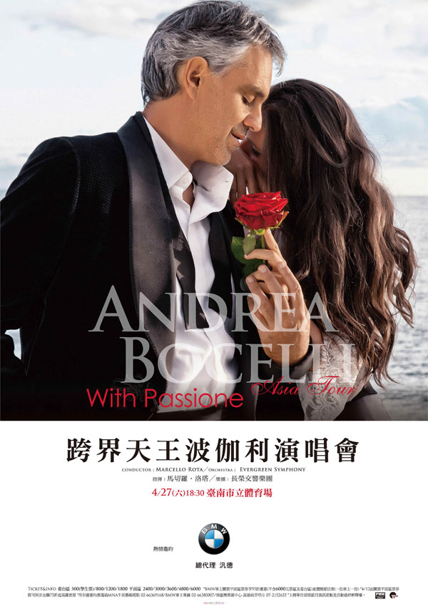 除了擁有得天獨厚的美妙嗓音,安德烈‧波伽利在柯雷里和帕華洛帝的先後提攜下,琢磨出撼動人心的演唱功力;汎德公司希望透過安德烈.波伽利的絕妙歌聲,傳達結合音樂藝術與造車美學的BMW之悅。即日起BMW車主訂票享專屬優惠,詳細內容以及購票方式請洽BMW車主貴賓購票專線:(02)6638-0007,或洽詢全台經銷商展示中心。BMW台灣總代理汎德公司邀請樂迷朋友共襄盛舉,欣賞安德烈‧波伽利融合古典與現代曲風的獨特樂章,體驗由音樂編織的心靈饗宴!