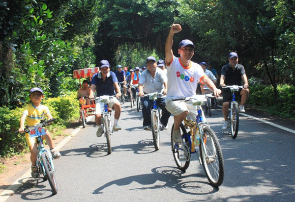 福特六和總裁李國寶(中)率領全體員工以實際行動愛地球,除了在永安漁港淨灘,更與員工一起騎鐵馬消遙遨遊當地知名的〝綠色隧道〞,實現行動綠生活!