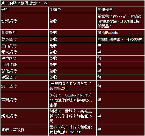 瞄準此波信用卡繳稅活動,包含如中信銀、台新銀、玉山銀等大型發卡行,陸續祭出了免手續費服務,並舉辦抽獎活動,好康多多。除了表格所列出的優惠銀行外,其餘銀行針對刷卡繳牌照稅等動作,收取的手續費用多在新台幣15-30元間,以陽信銀、新光銀最低;有些銀行則採取比例制,如兆豐銀收取牌照稅總額度的0.5%作為手續費,國泰世華則為0.3%。