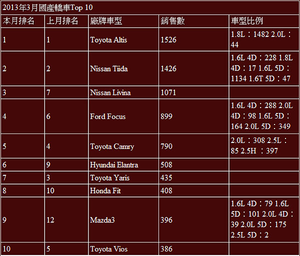 對於國產車廠排名,整體銷售表現還沒有足以改變戰局的狀況,也因此排名仍延續2月份的戰局,依舊保持龍頭的Toyota、亞軍的Mitsubishi、季軍Nissan、第4名Honda、第5名Ford,接下來依序為Hyundai、Mazda與Luxgen等。