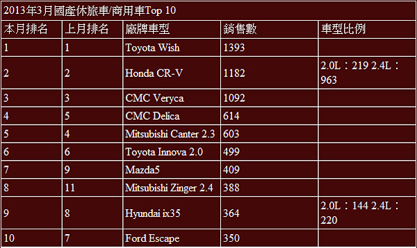 而在國產休旅/商用車級距方面,變動則不如乘用車級距來得劇烈,大致上維持原有排名,其中略有變動的,如Mazda5從第9名前進至第7名,明顯是受到降價動作所進步,但雖然Ford與Mitsubishi也同步針對Escape與Outlander推出促銷動作,但並未實際反應在銷售數字上,Escape除了從上個月第7名下滑至第10名外,Outlander更意外的跌出十名外,但換得的Zinger從上個月的第11名前進至本月第8名,也算意料之外的補償。