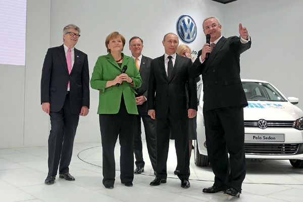根據VW集團的策略,俄羅斯市場佔有舉足輕重的地位,因此VW執行長Winterkorn(右一)、與德國總理Merkel(左二),自然不能待慢了俄國總理Putin(左四)。