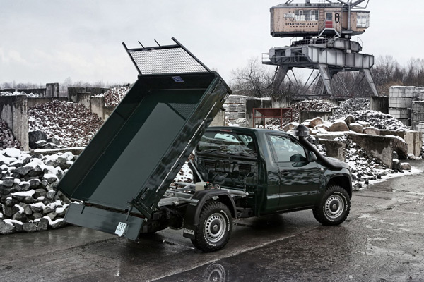 Amarok傾卸車裝配以輕量金屬材質打造的平板貨床,另外藉由電子液壓系統,讓貨床可以三向進行傾卸動作,這樣的設計,主要是提供散裝物材的運輸,對花園佈景、道路施工等相關業者來說更是實用。