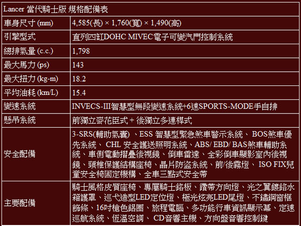 除了帥氣外型, Lancer車系向來以高標準的安全防護為訴求。「Lancer當代騎士版」全車配備駕駛座膝部SRS氣囊、ESS智慧型緊急煞車警示系統、BOS 煞車優先系統與CHL安全護送照明系統等安全配備,除此之外,安全再升級,更標配全彩倒車顯影室內後視鏡。以皇家級規格全面護航,讓你享受駕馭樂趣時能更加安心。