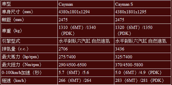 動力系統部分,全新Cayman搭載一具2.7 升引擎,單位輸出功率為每公升 101.6 hp,可輸出275hp/7400rpm,較前代多了10hp,最大馬力為290Nm/4500-6500rpm,Cayman S則搭載3.4升水平對臥六汽缸引擎,具備較前代車型增加5hp的325hp/7400rpm最大馬力,以及370Nm/4500-5800rpm最大馬力。變速系統則可選擇傳統六速手排或七速PDK雙離合器變速箱。