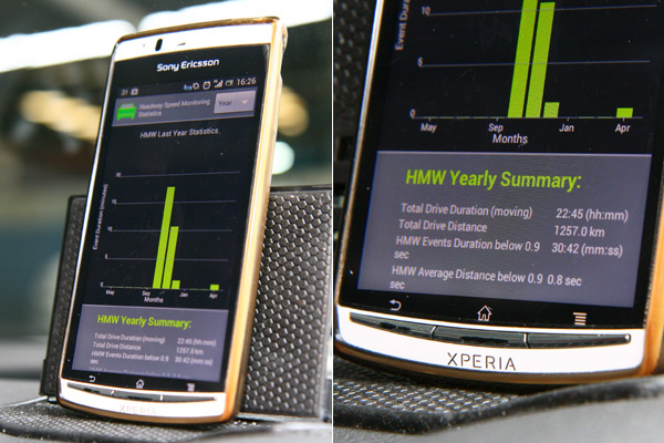 Mobileye 560提供藍牙無線連結智慧型手機的app程式,除了功能設定顯示之外,還能提供過去一年間警告作動的頻率、與相關的統計數字。
