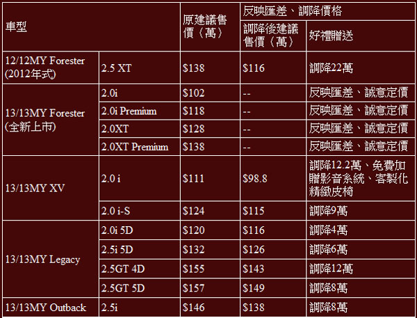 近日因日圓匯率起伏,Subaru台灣意美汽車為了回饋國內消費者的支持,特地調降旗下2013年式主力車系的建議售價,其中即以最時尚、個性化的XV車系售價最具市場競爭力,XV 2.0i 正式售價更以98.8萬的破盤價格回饋消費者(調降12.2萬),另免費加贈多媒體影音系統、及客製化精緻皮椅,總優惠幅度高達13 %!