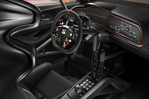 Leon Cup Racer與Leon市售車共用的部份,僅有整合DRL晝行燈的全LED頭燈組、LED尾燈組、以及車頂鈑件,至於內裝可就是天差地遠了;Leon Cup Racer車內裝上了防滾籠,另外搭配附有HANS頭頸防護系統的桶型賽車椅,而多功能的賽車用方向盤、以及方向盤後方的TFT薄膜液晶顯示,更呈現Leon Cup Racer純競技取向的斯巴達風格。