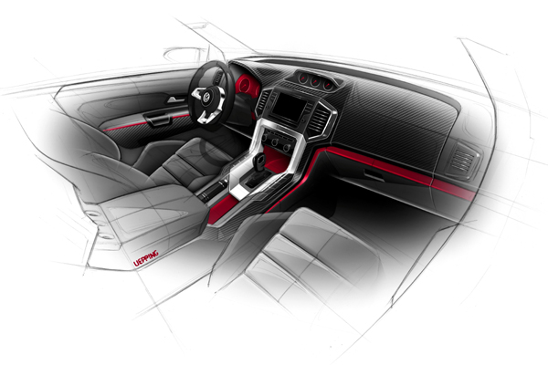 VW商用車設計團隊也升級了Amarok概念車的內裝,包括有高抓附力的桶型運動化座椅、類碳纖維材質的儀表面板與車門內飾板,另外還換裝運動化方向盤、以及車室內部份的紅色組件點綴。這輛概念VW Amarok的實車,將於當地時間5月8日展開的Worthersee-Tour活動裡正式現身。